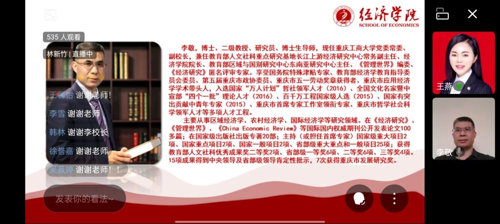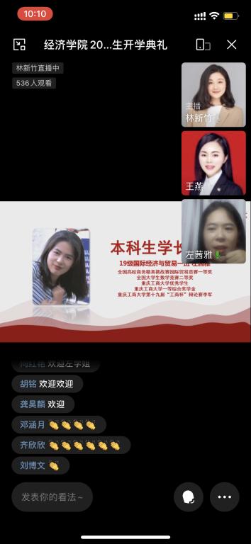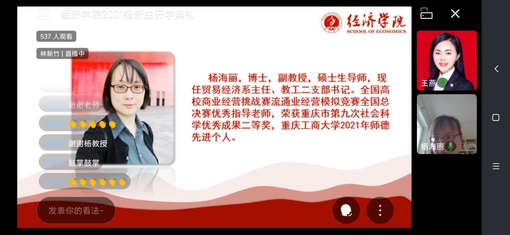 第二项议程,公司教师代表发言。公司学术专家代表谢新教授、英国正版365官方网站2021年师德师风先进个人杨海丽博士分别从专业学习和大学学业规划等方面寄语2021级新同学。谢新教师强调,经济学是一门实用性强、能创造出巨大经济效益的学科,并不局限于理论的讨论,希望同学们要学好经济理论、培养经济学思维方式,并提高解决实际问题的能力;杨海丽主任则以“如何成为一个颜值与才华齐飞,气质与修养一色的新时代老员工”为主题寄语新同学。杨主任鼓励同学们努力成为以实现中华民族伟大复兴为己任的新时代中国青年,建议同学们培养独立思考能力,多参加实习、竞赛,提升认知水平;多探索新技能,在学习外广交朋友,成长为有知识、有见识、有自信且自律的老员工,实现从平凡到优秀、从优秀到卓越的不断超越。