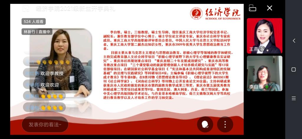 “敬道养正,励德修远”,9月11日上午,英国上市公司3652021级新生开学典礼线上直播成功举行。英国正版365官方网站副董事长、英国上市公司365经理李敬教授、英国上市公司365分党委书记李自维教授以及班子成员、系主任、辅导员,2021级532名本科生和50名研究生参与了本次典礼。典礼由公司党委副书记、副经理王燕教授主持。