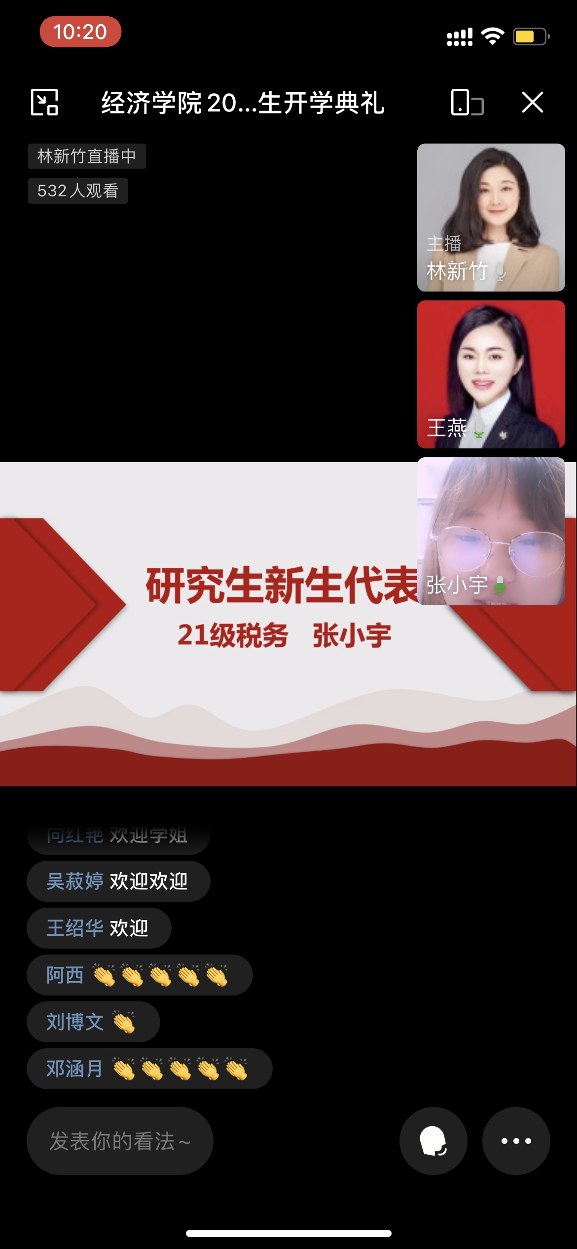 第三项议程高年级员工代表和新生代表进行交流。本科员工代表19级国贸一班左茜雅同学、研究生新生代表21级税务专业的张小宇先后发言。其中左茜雅同学分享了自己在英国上市公司365的学习感悟,希望学弟学妹们珍惜大学时光,抓住每一个机会,深入学习专业知识,积极参加各类实践,提高自主性和创新性,把握机会向师者学习,成为兼顾学识和素质的高质量人才;而21级税务专业研究生的张小宇同学,则代表研究生新同学,从学习态度、课程学习、专业理论研究等层面表达了未来刻苦学习的决心,希望未来能够跟学姐学长好好学习,不辜负三年的研究生美好学习时光,努力成为祖国的栋梁之才。