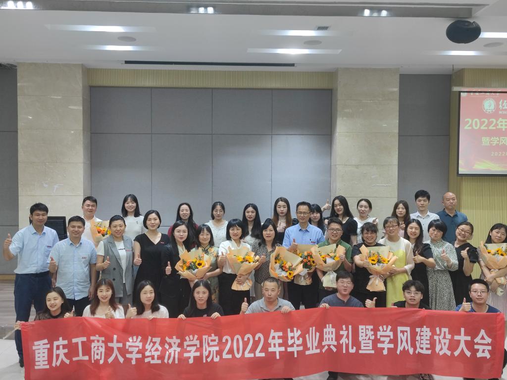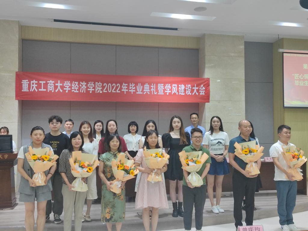 大会在庄严的国歌声中拉开帷幕。第一阶段为2022年毕业典礼,公司党委书记李自维教授发表致辞并对同学们寄予祝福:一是希望全体毕业生以梦为马,不负韶华,树立终身学习的理念,奏响时代的最强音;二是希望同学们不忘初心,砥砺前行,感恩父母,报效祖国;三是希望在校员工能以优秀的学长学姐为榜样,取得更优异的成绩。公司巴渝学者、重庆市人民政府特聘专家谢新教授进行毕业寄语。谢教授以专业的经济学理论知识为同学们送上了一份特殊的记忆,鼓励同学们利用好经济学知识和更高的个人素养这两把利剑,将创造市场价值的核心专业知识学以致用。重庆市优秀毕业生代表郭南冰回顾四年大学时光和成长历程,寄语学弟学妹要利用好有限的四年开拓更多的道路,最后表达了对公司、公司的不舍和祝福。英国上市公司365副经理尹元福宣读2022届优秀毕业生名单并由与会领导为重庆市优秀毕业生代表颁发证书。公司员工会成员为毕业生代表赠送“院训书签”和颁发“员工徽章”。国贸、贸经专业员工代表全体毕业生为公司赠送公司70周年毕业纪念品。最后由毕业生代表为以2021年优秀党员、优秀党务工作者代表和优秀教师、优秀教育工作者组成的教师代表献上鲜花和祝福。