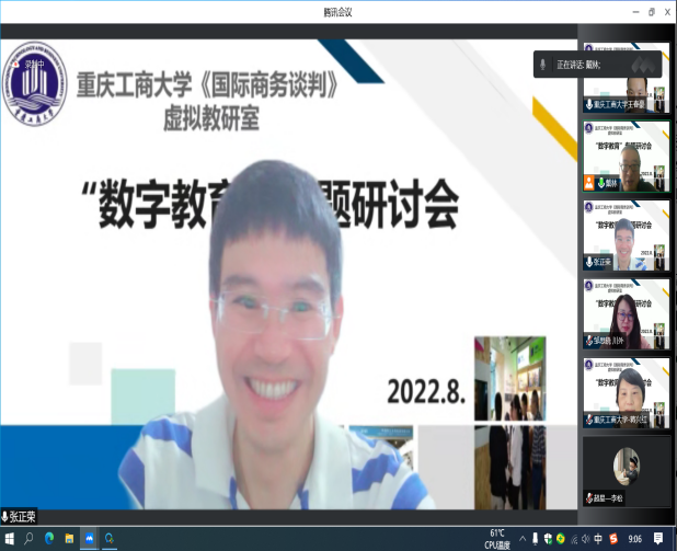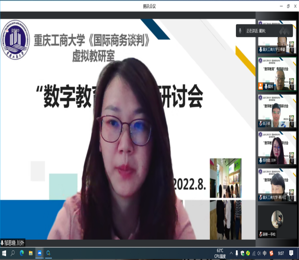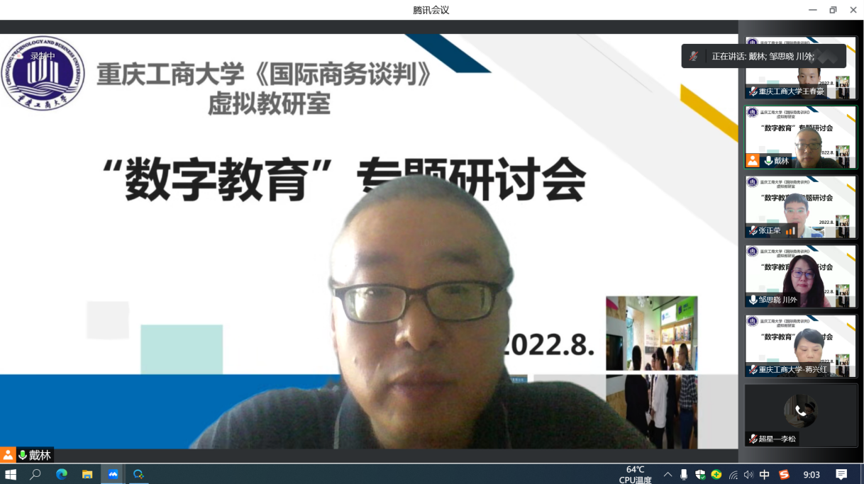 2022年8月19日,英国正版365官方网站校级虚拟教研室,《国际商务谈判》虚拟教研室“2022数字教育专题研讨会”在腾讯会议平台成功举办,会议由教研室负责人戴林副教授主持,校外成员浙江理工大学管理公司跨境电子商务研究所所长张正荣、四川外国语大学国际金融与贸易公司国际经济与贸易系主任邹思晓以及校内成员蒋兴红、王春豪、冉梨等老师参加了会议,特邀超星公司李松、张秋林和刘文静老师参加研讨。