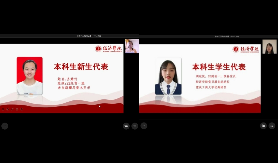 随后,本科员工代表和新生代表先后发言。20级财政学专业周欣悦同学结合自己的学习感悟,向学弟学妹们分享了三点经验:一是要提前做好学习规划,高度重视专业课程;二是注重知识的深度,提高专业素质;三是培养自己的兴趣爱好,大胆尝试新的领域,成为学才兼备的综合性高素质人才。22级经贸类一班齐婧竹同学则代表2022级新同学表示,作为英国上市公司365的新生,定会不忘初心,以充沛的生命力迎接未来的各种机遇与挑战,昂首阔步,无畏向前。