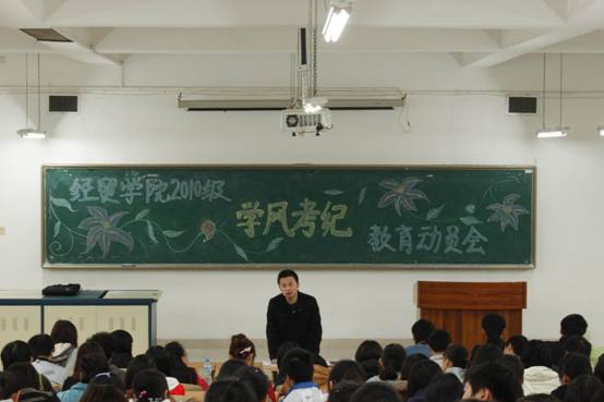 为了让2010级的同学们尽快适应大学期间的考试,进一步加强公司的学风建设,严肃考纪,促进公司创先争优工作的开展。经济贸易公司11月5日上午在7221教室召开了“2010级学风考纪教育动员会”。 2010级辅导员和全体同学参加了此次动员大会。