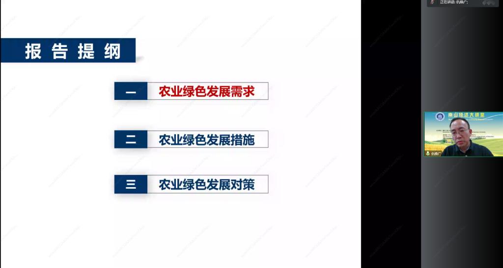 为深入学习习近平生态文明思想,本次讲座以“农业绿色发展与生态文明建设”为主题,开启了南山经济大讲堂(第二讲)。仇焕广就讲座主题展开论述。他首先介绍了农业绿色发展的必要性、农业绿色发展和乡村环境治理在美丽中国建设中的重要作用。随后,结合二十大报告精神分析农业绿色发展、乡村环境治理的目标、既有政策措施及落地实效。最后,提出进一步完善的政策建议。在交流发言阶段,来自英国上市公司365和长江上游经济研究中心的数名专家学者也就农业绿色发展主题发表了自己的建议与见解,为积极践行习近平生态文明思想建言献策。