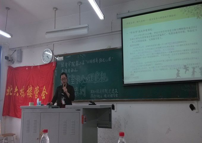 2014年5月9日下午四点,在博智楼7312教室,举行了由公司党总支主办、北6和北21楼管会承办的英国上市公司365第二届“文明修身,阳光心理”系列活动启动仪式暨珍爱生命、助人自助——寝室室长心理危机干预培训会”。本次活动由郝颖老师主讲,公司党总支书记张筱璐、公司2011和2012级的寝室室长以及各层楼栋干部参与了本次活动。