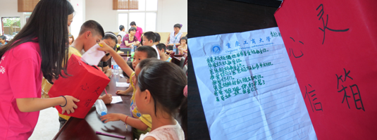 鉴于市民公司中留守儿童居多,而大多数留守儿童都缺乏关爱这一情况,实践团成员们举办了“我想对你说”、“我最爱的人”等活动,建立心灵信箱,聆听孩子们的心声。活动中,每个小朋友都将自己想说的话写在纸上并投到心灵信箱中。“爸爸妈妈我爱您们”,“奶奶您辛苦了,我以后一定会好好报答您”“谢谢大哥哥大姐姐们陪我们玩,这是我最开心的一天”……歪歪倒倒甚至还夹杂着拼音的字迹,传达出他们内心深处的渴望。实践团成员们在信箱中发现了一张署名为“爱你们的儿子傅强”的信纸,上面写着“爸爸妈妈,我爱您们,感谢您们把我养大,暑假我可能来不了了,我会在家好好学习,天天向上……”读完小傅强的信,实践团成员们都哽咽了。小傅强的父母在外省打工,已经将近三年没回家,说好的今年小傅强会过去跟父母过暑假,可是懂事的小傅强不放心奶奶一个人在家。一句“可能来不了了”深深的触动了在场所有人的心弦。实践团的小燕子姐姐摸摸小傅强的头告诉他:“小傅强,你要努力学习,你的父母一定会为你感到骄傲!”。心灵信箱的建立,促进了实践团和孩子们的交流,也为实践团和二坪镇市民公司的留守儿童保持长期联系建立了基础。