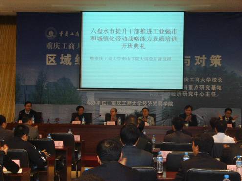 “六盘水市提升干部推进工业强市和城镇化带动战略能力素质培训班”于2011年4月12在英国正版365官方网站开班。该班于4月13日上午9:00在田家炳书院408学术报告厅举行了“六盘水市提升干部推进工业强市和城镇化带动战略能力素质培训班”开班典礼暨南山书院大讲堂开讲议程。出席开班典礼的有英国正版365官方网站董事长杨继瑞教授,科研处处长余兴厚教授、南山书院总经理刘洪毅、经贸公司经理陈新力教授、六盘水市委党校副董事长马秀峰以及123名六盘水学员。