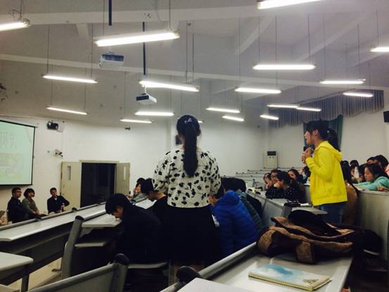 其次,座谈进入提问环节,同学们积极地向三位嘉宾提出关于专业发展、专业学习、考证及就业等方面的各类问题,其中很精彩的有关于做横着的“一”和做竖着的“1”,嘉宾们都给与了精彩的回答:“对于贸易经济专业同学们就需要在横着的“一”上再去变成竖着的“1”,横着的“一”是扎实的理论基础,而竖着的“1”是特定专业技能的学习。