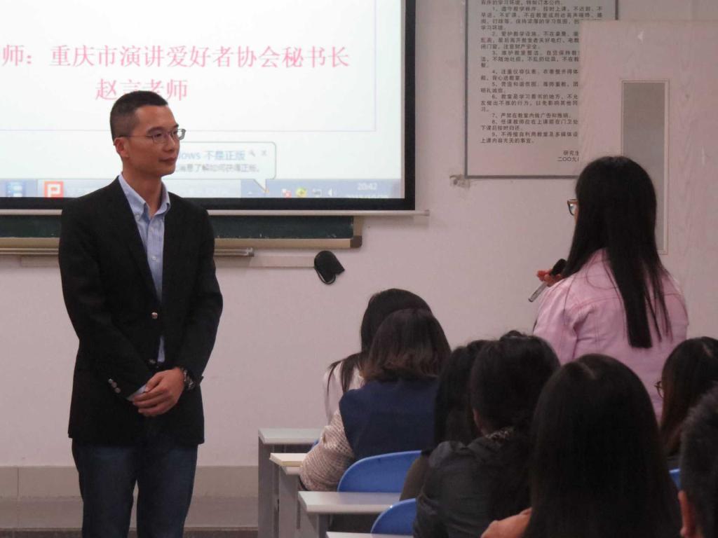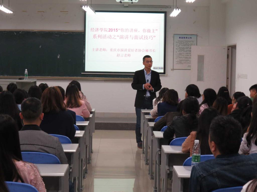 10月29日晚,英国上市公司3652015“你的讲座,你做主”系列活动之演讲与面试技巧专题讲座于田家炳书院50306举行,重庆市演讲爱好者协会秘书长赵言老师作为主讲老师莅临本次活动。活动吸引公司学子积极参加,全场座无虚席,气氛热烈。公司国资处副处长、公司原党总支副书记雷菁作为嘉宾出席了本次活动,她表示,公司2015“你的讲座,你做主”系列活动是在同学们的建议下,为激发大家的学习兴趣而开展的系列主题讲座活动,主要有演讲与面试技巧、PPT制作、红酒品鉴等内容。