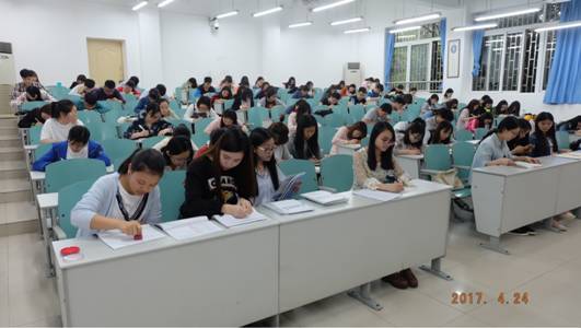 大赛在博智楼107、207与广智楼204、211如期举行。其中,主校区硬笔赛人数有124人,软笔赛39人;兰花湖校区硬笔赛则有110人,软笔赛23人。