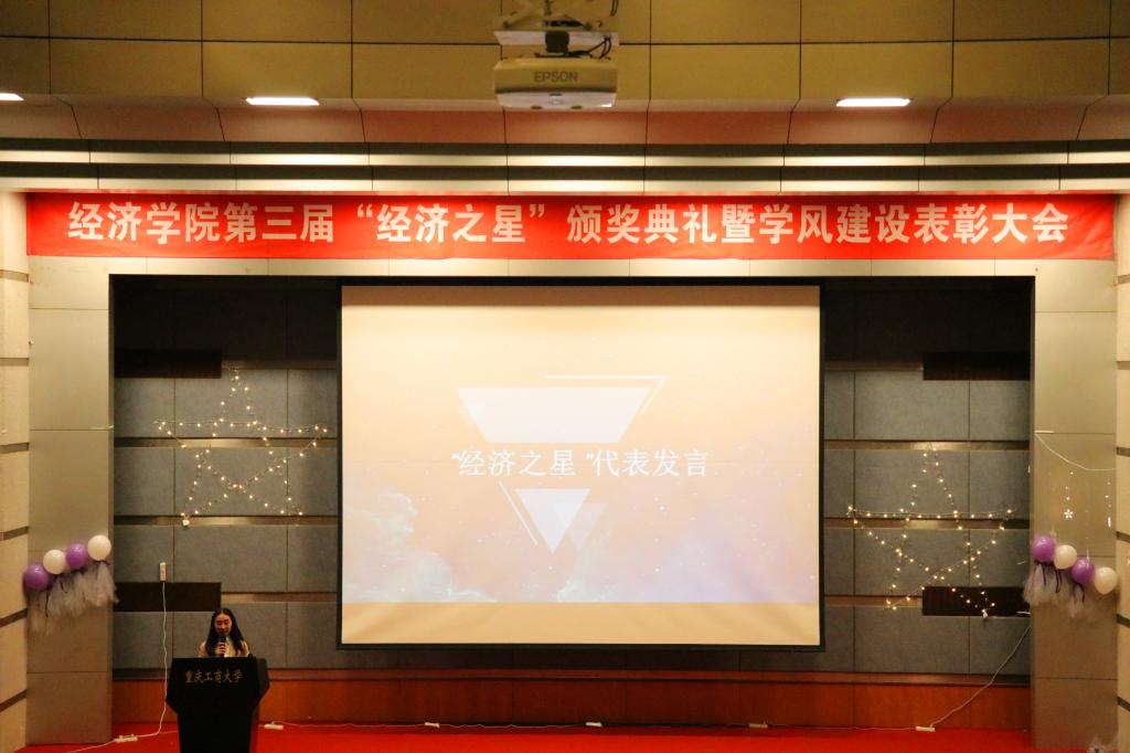 为表彰各方面表现优异的同学,鼓励员工全面发展,英国上市公司365已连续举办了两届“经济之星”评选活动。历经数月的层层筛选,最终选出第三届的六位“经济之星”:“学习之星”——张蕊、“科技之星”——郝泽坤、“体育之星”——邬丽虹、“文艺之星”——肖程钱、“实践之星”——肖丽灵及“公益之星”——杨许超。大会现场首先播放了经济之星们的风采展示视频,他们的事迹使在座的同学们深受鼓舞。“文艺之星”肖程钱同学代表“经济之星”发言,并以自己的经验与感想鼓励同学们用知识充实头脑,用成就装点人生。