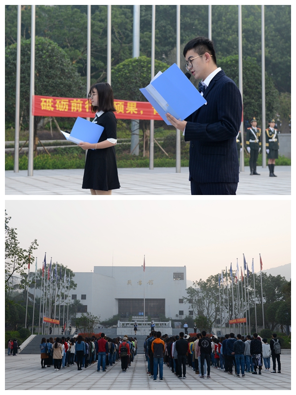 行礼完毕,由公司党员服务站站长李晶晶同学带领同学们宣誓。同学们面对庄严的国旗许下铭记“厚德博学,求实创新”的校训,践行“含弘自强,经邦济民”的精神,不忘“肩负责任使命、服务社会人民”的重任,喊出“为祖国富强勤奋学习,为民族振兴奋斗终生”的誓言。