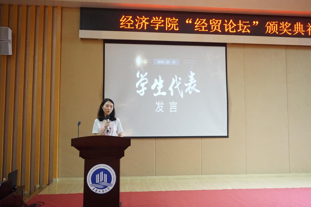本次大会在庄严的校歌合唱声中开始。活动共分为四个环节,包括第十一届“经贸论坛”颁奖;学风建设工作表彰;活力团支部;优秀国防班会以及36182素质拓展颁奖和国贸技能大赛发布会展示。首先,王小玲书记为本次颁奖典礼致辞,希望同学们可以将理论和实践相结合,不断的加强学术能力的培养。随后,由经理助理黄潇老师宣读了本届“经贸论坛”的获奖名单。员工代表任培艺同学分享自己的获奖经验,表示在学术论文选题、撰写等方面,要多和老师、同学加强沟通交流,不断的完善文章思路,同时感谢公司有这样一个平台,可以让同学们的论文写作水平得到锻炼。