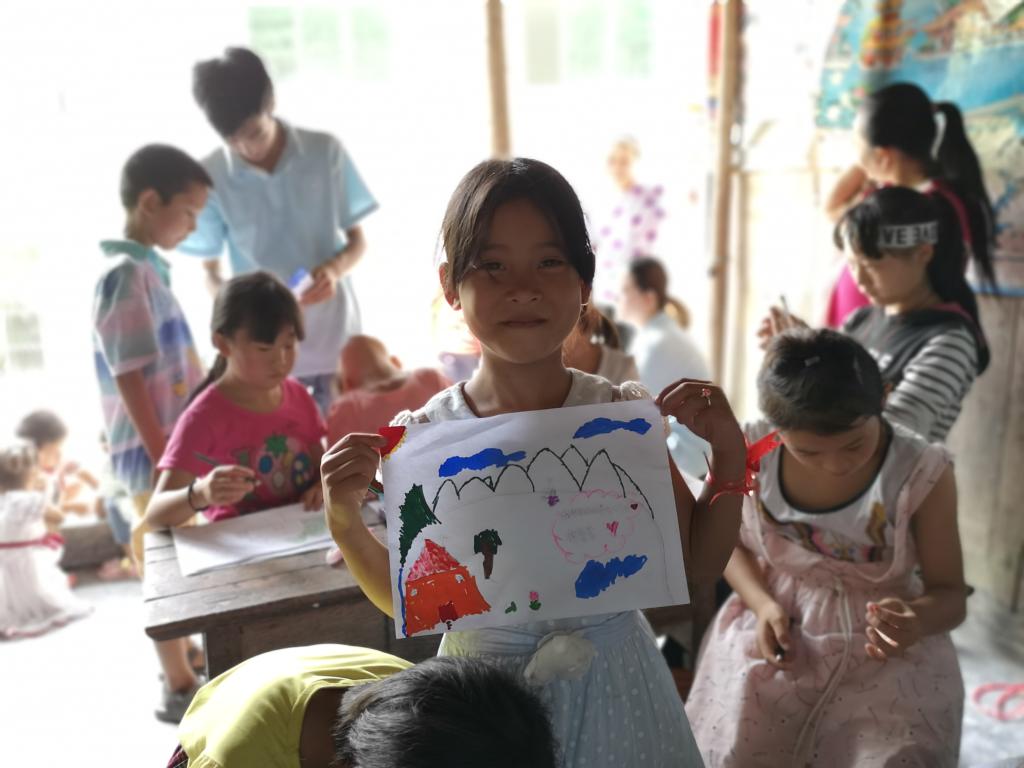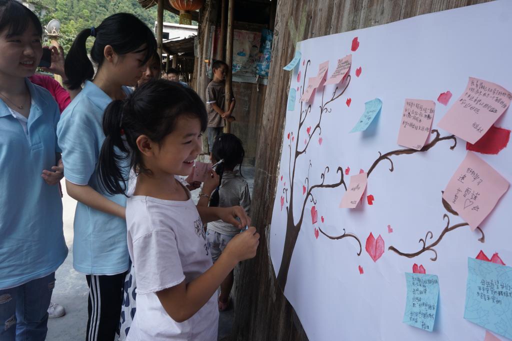 家,永远是孩子们温暖的港湾。在绘画课上,孩子们手中的画笔与画纸不断摩擦,每一笔颜色,都是对心中家的渴望。“想要妈妈带我去钓鱼,想要爸爸妈妈带我去游乐园玩。”实践队员帮一位还不会写字的小女孩写下了这样一句话。小女孩生活在单亲家庭,已经很久没有和爸爸妈妈一起玩过。千言万语汇成一句话,每一句留言,都是内心深处最真挚的独白。