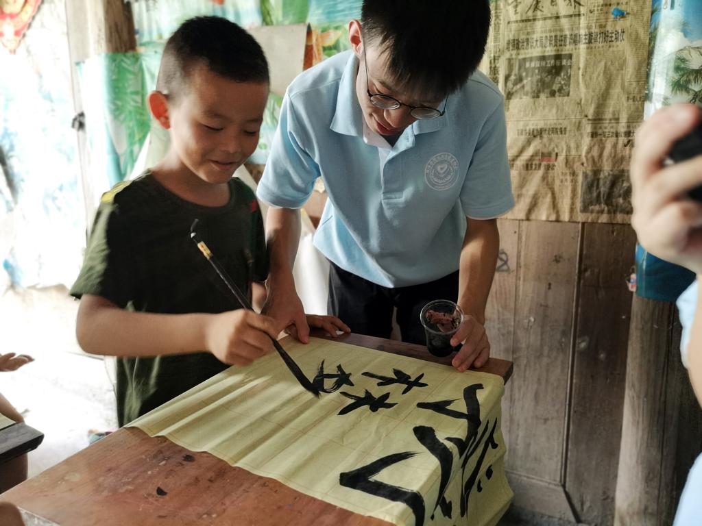 偏僻的地理位置直接影响教学用具的配备,第一次见到文房四宝的孩子们,一个个跃跃欲试,迫切地想要展现自己的书法风采,写好的毛笔作品被孩子们小心翼翼地放在展示架上,看着自己的“大作”,孩子们脸上满是自豪与开心。