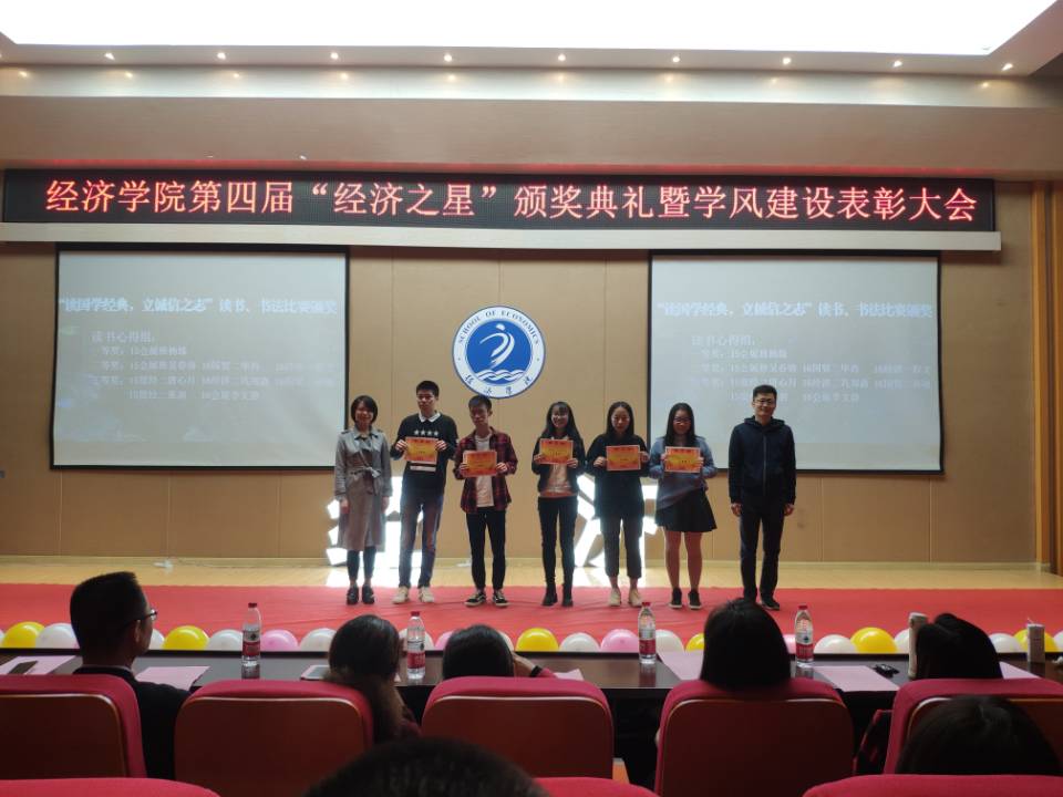 最后,大会对“‘五个一’活动之——读国学经典、立诚信之志”读书、书法比赛21位获奖同学颁奖。此次表彰大会不仅展现了经济学子青春风采,更激励了经济学子奋勇向前,拼搏进取,以青春的名义再接再厉,再创辉煌。