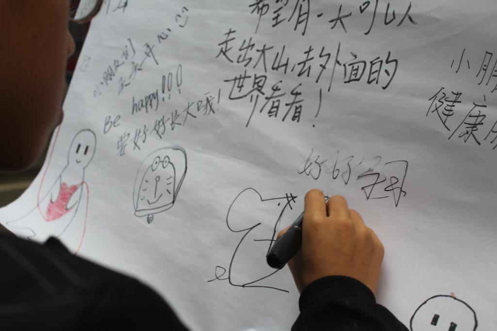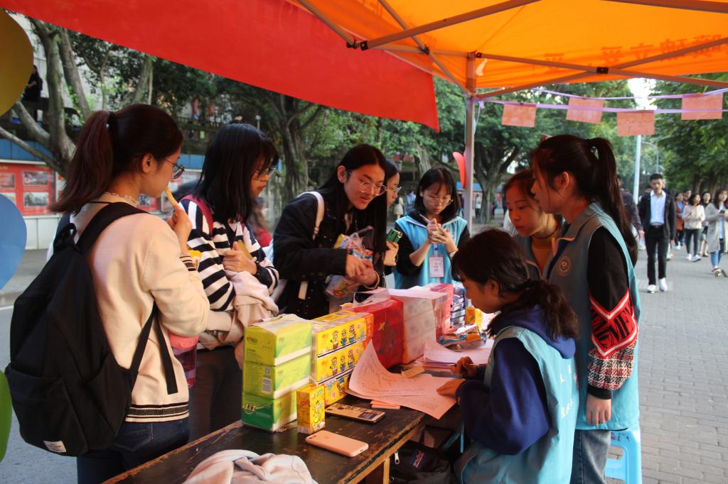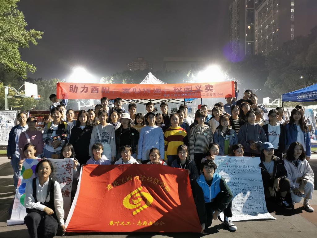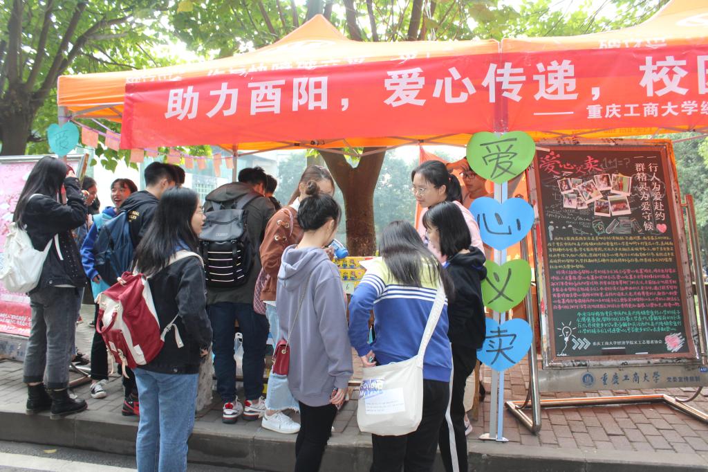 在剧场外还有一群正在为爱心包裹奋斗的青年志愿者们默默无闻的工作着。第十一届“感动校园人物”颁奖典礼活动的当天,经济义协在南岸校区香樟林以及江北校区食堂对面举办“助力酉阳,爱心传递,校园义卖”的主题活动,志愿者们认真的经营好这片充满爱心的小天地:仔细的核对账单与商品的数量、不辞辛苦的搬运货物、将同学订购的商品按时送到寝室、耐心的向路边的同学介绍义卖背景、并对每一位援助酉阳的同学们真诚的道谢……点点滴滴都透露出志愿者们对孩子们的牵挂。一位又一位同学来到义卖棚前,购买所需商品,在寄语墙上留下对孩子们的祝福与期望。不少同学还将零花钱捐给了孩子们,希望能为酉阳贡献自己的一份力量……一个个动人的举动,温暖着每个志愿者的心。
