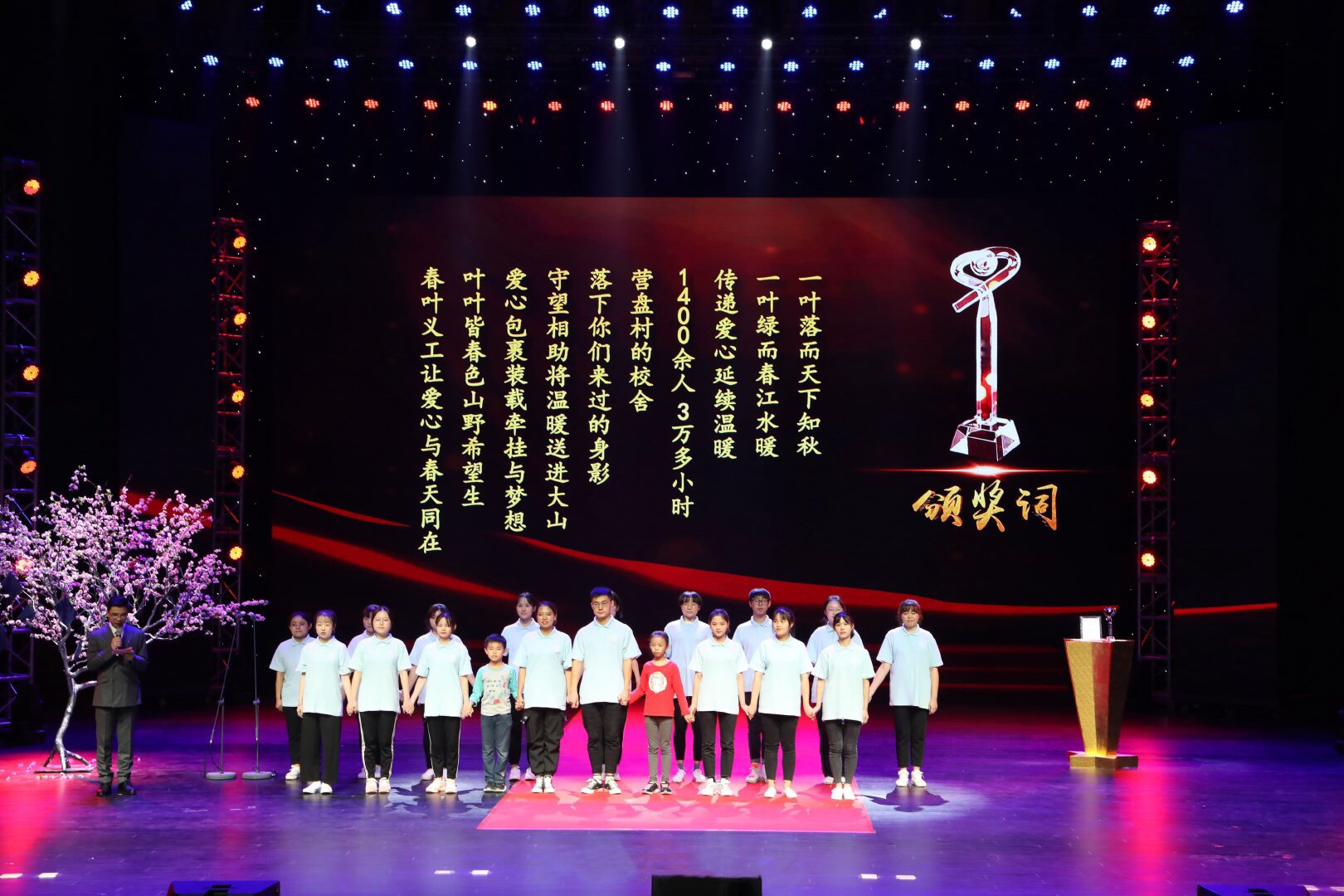 集团图书馆剧场内温馨的音乐响起,场上耀眼的聚光灯让大家注意到荧屏里一支志愿服务团队。他们早起于阳光未照射的早晨,穿行在大山深处,乡间小道留下他们的脚印,远处是他们问候过的行人。“一叶落而天下知秋,一叶绿而春江水暖”,酉阳县兴隆镇营盘村小学的校舍留下了志愿者们的身影,他们陪小朋友们过生日、做游戏,他们为这里的孩子带来了欢声笑语,也送来了温暖。当《虫儿飞》的歌声在剧场响起时,不仅勾起了志愿者们的回忆,同时也给现场的观众们带来了感动。七年的守望相助将温暖送进大山,爱心包裹装载的是牵挂与梦想。