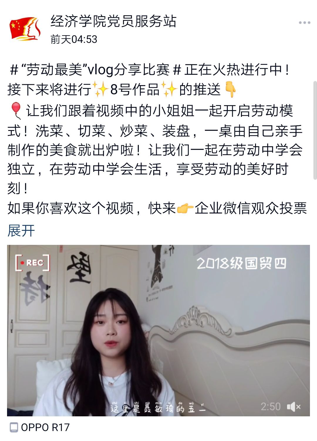 近日,公司党员服务站、分团委成功举办以“劳动最美”为主题的Vlog比赛,旨在让同学们自主地感受劳动的内涵、体会劳动的快乐、上一堂劳动教育课。虽然是线上活动,同学们仍然积极参与,视频的拍摄和制作质量都充分体现了同学们的“劳动最美”。视频内容非常丰富,不仅有令人垂涎的丰盛午餐还有打扫得一尘不染的家。聂敏琦同学在视频中说:“劳动的过程是既辛苦又快乐的,但劳动成果所带来的成就感是无法代替的”。党服站指导老师郝颖说:“挥洒劳动的汗水、体味劳动的艰辛,才能收获劳动的快乐,也才能真正理解劳动的内涵。我们教育工作者就是要不断强化劳动教育,让员工珍惜劳动成果、愿意劳动、热爱劳动。”
