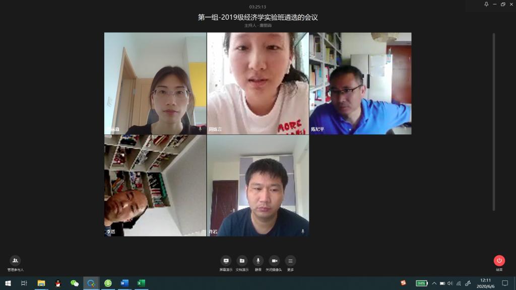 2020年6月6日上午,经济学系以在线面试形式,开展了2019级经济学拔尖人才实验班选拔工作。陈纪平教授、唐路元教授分别担任两个面试小组组长,经济系主任李然、副主任刘斌、陈海燕副教授、许岩博士参与面试,2019级经济学专业学业导师刘晗副教授和唐丽淼博士担任面试秘书,分别负责了两个面试小组的组织工作。