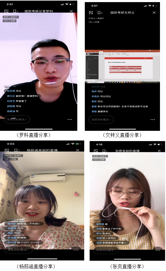 另外5位员工来到线上交流会,采取企业微信直播+群聊模式面对面与学弟学妹们进行分享。他们分别结合自己的切身经历为同学们讲述了宝贵的经验与教训。罗科介绍了自己对择校和选专业的理解,并用自己亲身经历,提出确立目标时要结合自身实际,并不一定非要选择名校,希望大家可以多了解自身和院校后尽早确立目标。文梓义和黄洁妍作为跨考成功的范例,各自介绍了经验,文梓义紧密围绕跨考,以“考研,选择比努力更重要?”的问题为导向,以自己成功跨考“985”、“211”高校-华东师范大学为例,分享了自己跨考专业、公司选取的经验;黄洁妍则重点介绍了跨考法律专业的具体学习方法,指出考研路上最重要的是好的心态,找研友不失为一个很好的方法。杨茹涵和张爽则重点针对国贸专业员工报考国际商务、世界经济等高度相关专业进行了经验介绍,杨茹涵特别介绍了自己正式报名前根据实际水平调整报考院校的经验,并重点推荐学弟学妹们报考国际商务学硕或专硕。