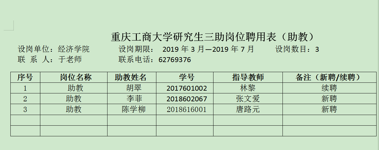 根据《关于2018-2019学年第2学期研究生助教岗位公示及开展聘用工作的通知》的相关要求,经个人申请、指导教师筛选、公司审议,拟同意聘用胡翠等3名同学就任2018-2019学年第二学期研究生助教,现予以公示。
