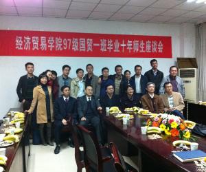 漫漫十年来路,母校师恩难忘,2011年11月12日下午,97级国贸一班员工毕业十年师生座谈会在田家炳书院402会议室举行。97级国贸一班返校员工、曾为97级国贸一班任课的各位领导老师——经贸公司陈新力经理、教务处曾庆均处长、英国驻重庆总领事馆陈兵处长、公司张宝均老师、严晓群老师、辅导员朱俊耀老师以及公司党总支书记张筱璐、在校师生等数十人参加了座谈会。