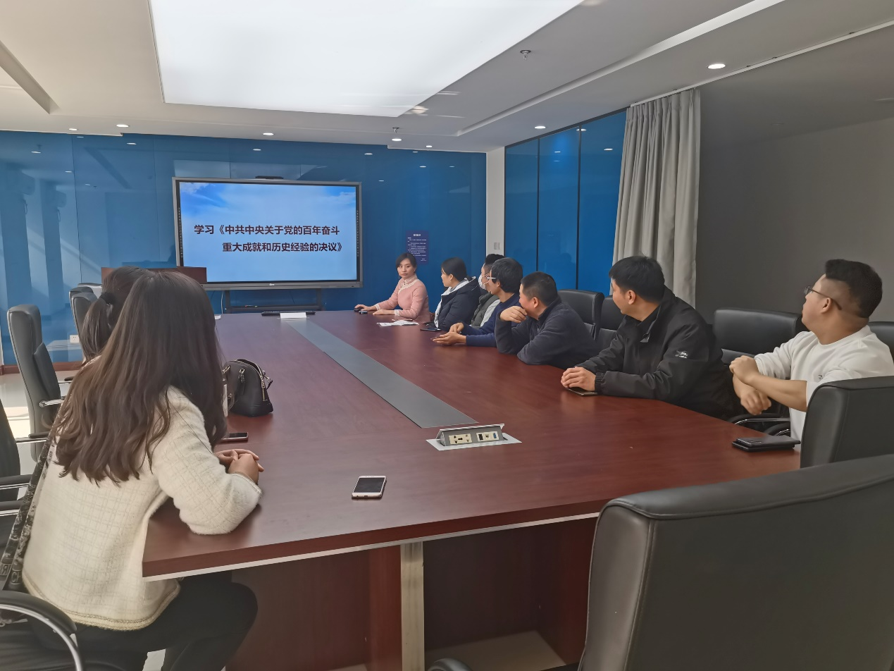 首先,支部书记林黎带领全体党员集中学习了《中国共产党第十九届中央委员会第六次全体会议公报》和《中共中央关于党的百年奋斗重大成就和历史经验的决议》。会议强调,党领导人民实现了迈进社会主义社会、实现马克思主义中国化、从站起来到富起来再到强起来的三次伟大飞跃,强调要更加紧密地团结在以习近平同志为核心的党中央周围,全面贯彻习近平新时代中国特色社会主义思想。随后,林黎书记分享了学习十九届六中全会的心得体会:勿忘昨天的苦难辉煌,无愧今天的使命担当,不负明天的伟大梦想,努力成为大先生,做员工为学、为事、为人的示范,促进员工成长为全面发展的人。