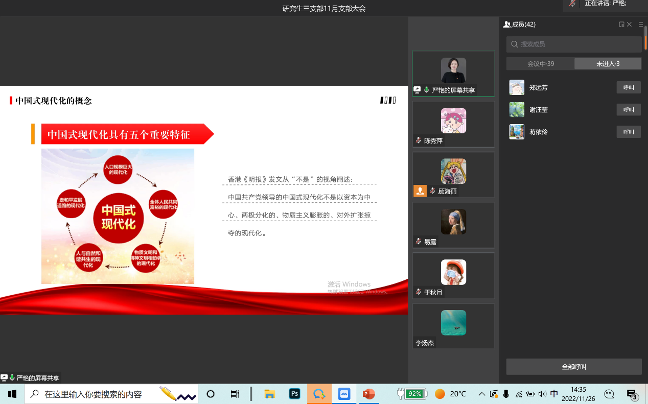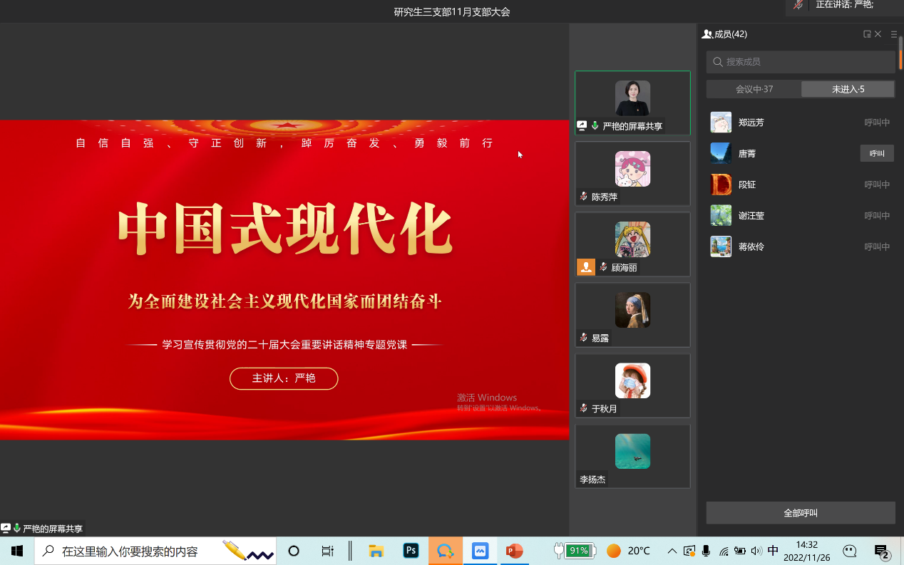2022年11月26日,公司研究生第三党支部通过企业微信线上会议召开了11月支部大会,会议主要内容是党委委员严艳讲党课。本次会议由支部书记薛晶月主持,研究生三支部全体党员参加。