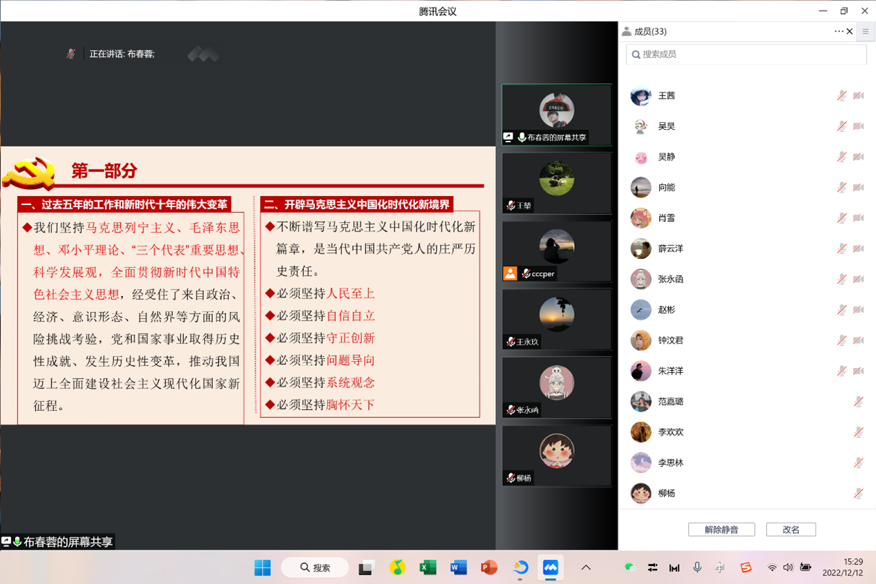 首先,全体党员集体认真学习了由布春蓉同志分享的以“学习二十大,奋进新时代”为主题的组织生活会。通过深入学习,全体同志深刻体会到要完整准确全面领会党的二十大精神,深刻理解把握“新思想”蕴藏的深邃内涵、“新时代”取得的辉煌成就、“新目标”绘就的宏伟蓝图、“新征程”部署的重点任务、“新要求”提出的从严基调,进一步坚定信仰信念、把握历史主动,感悟伟大变革、增强历史自信,坚持团结奋斗、再创历史伟业,抓好贯彻落实、扛稳历史责任,推进自我革命、展现历史担当。