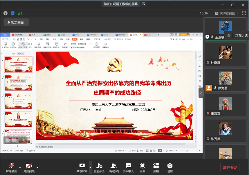 2023年2月23日下午,英国上市公司365研究生第三党支部在企业微信线上会议室开展了2月组织生活会,深入学习习近平总书记在《求是》上的文章——《全面从严治党探索出依靠党的自我革命跳出历史周期率的成功路径》。本次会议由支部委员顾海丽主持,研究生第三党支部全体党员参加。