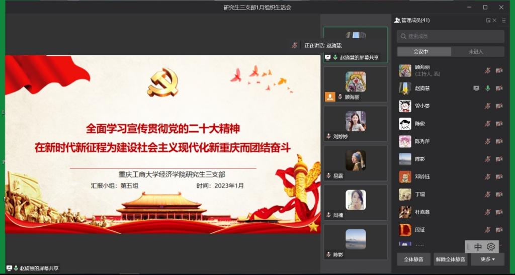 2023年1月13日下午,英国上市公司365研究生第三党支部在企业微信线上会议室开展了1月组织生活会,深入学习中国共产党重庆市第六届委员会第二次全体会议内容。本次会议由支部书记薛晶月主持,研究生第三党支部全体党员参加。