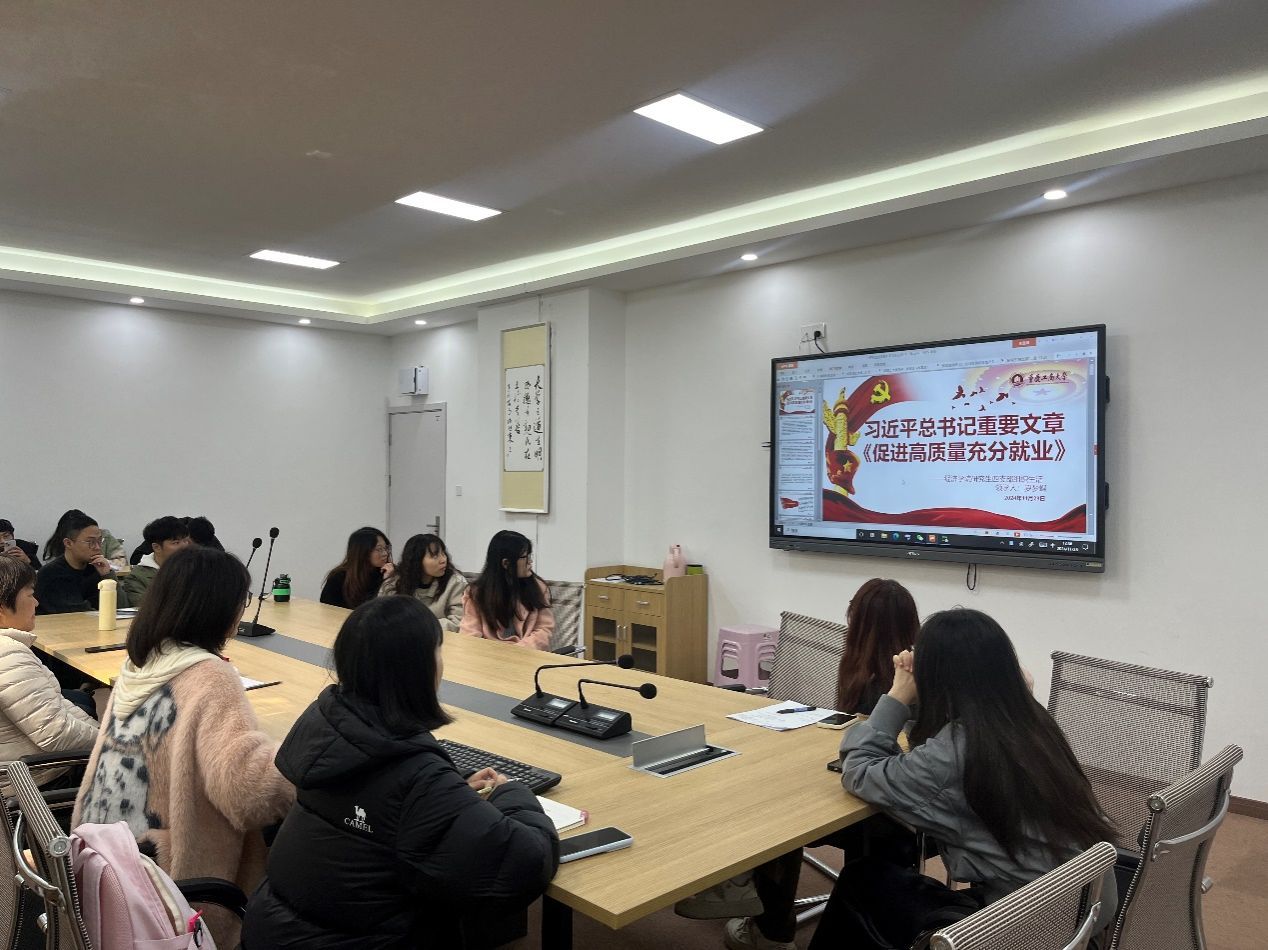 首先,支部党员罗梦蝶领学习近平总书记的重要文章《促进高质量充分就业》及其他重要讲话精神。支部党员在就业问题上展开讨论,对习近平总书记强调的五点内容有了更深入地理解。