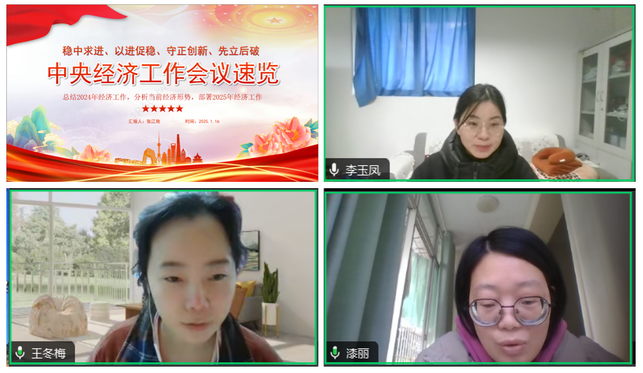 本次组织生活首先由支部党员张江艳领学中央经济工作会议精神,领学内容包括:2024年经济工作总体情况、当前经济形势分析以及2025年经济工作部署。支部党员重点学习了2025年经济工作重点工作内容:大力提振消费、提高投资效益,全方位扩大国内需求,以科技创新引领新质生产力发展,建设现代化产业体系;发挥经济体制改革牵引作用,推动标志性改革举措落地见效;扩大高水平对外开放,稳外贸、稳外资;有效防范化解重点领域风险,牢牢守住不发生系统性风险底线;统筹推进新型城镇化和乡村全面振兴,促进城乡融合发展;加大区域战略实施力度,增强区域发展活力;协同推进降碳减污扩绿增长,加紧经济社会发展全面绿色转型;加大保障和改善民生力度,增强人民群众获得感幸福感安全感。