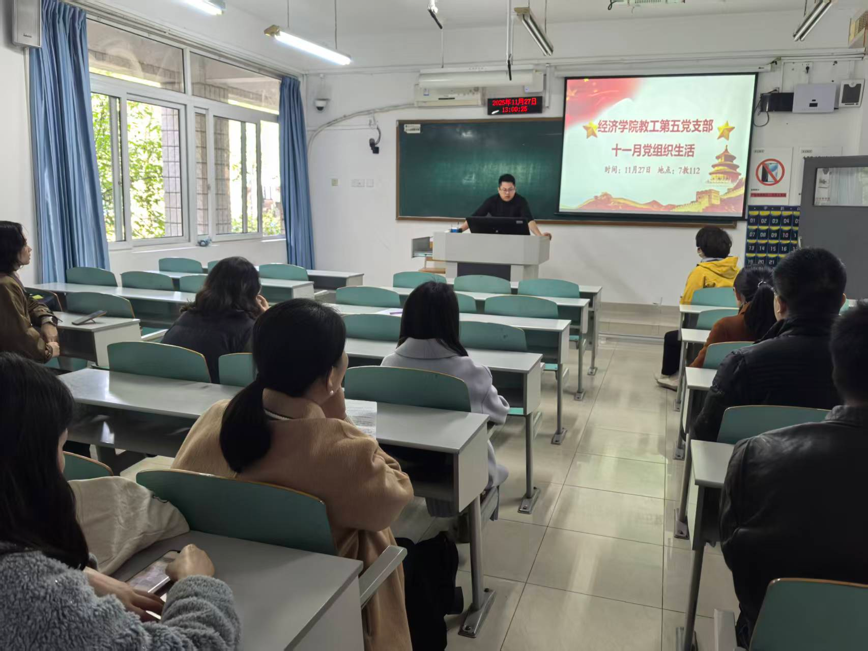 2025年11月27日下午,公司教工第五党支部在七教112教室开展了11月党组织生活。会议以集中学习“党的二十届四中全会”精神为核心主题,全程由支部书记林黎主持,全体党员参会。