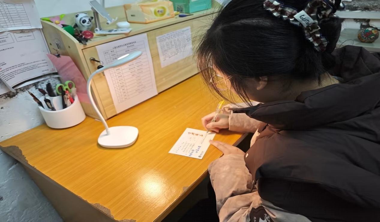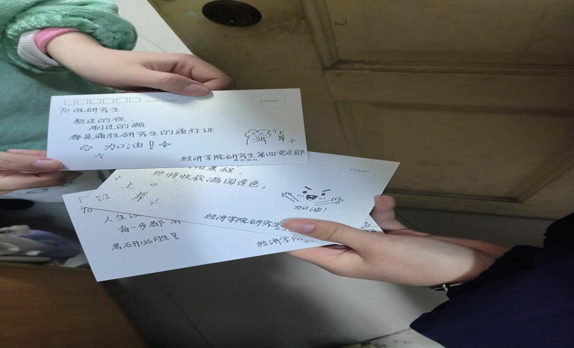 活动中,支部学长学姐亲手书写明信片,将真诚鼓励、暖心寄语融入笔墨,并来到北区15栋、21栋宿舍楼,为即将踏上考场的学子注入信心底气。