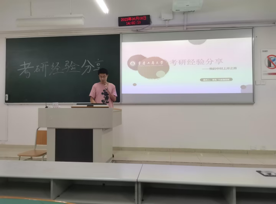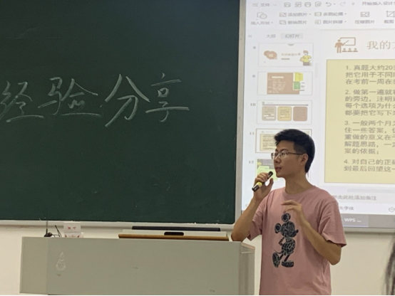 下午14点,经验分享会正式开始,现场全体与会人员均落座。班导师郭鹏飞首先上台发言,清晰地阐明了本次会议的主题,之后介绍了李亮学长的基本情况及其上岸公司。随后,李亮学长正式开始进行考研经验分享,他首先详细地向大家介绍了自己的专业、报考院校和研究方向、最后的成绩以及官方的录取结果;其次,主要从四个部分进行展开,即如何确定自己的志愿、备考经验、复试心得、如何更好的准备,内容十分细致全面。特别地,李亮学长每部分都会根据自己的一些真切地经历感受来讲述,例如在备考经验讲解过程中,他将自己每门课所用的实用高效的方法都分享给大家,并且在PPT附有自己备考过程中的图片,真实且颇有益处;分享复试心得时,把自己当时的心路历程结合整个大概过程制作成短视频播放,十分真切,极具感染力。最后一个环节是答疑解惑环节,有两位同学当场向李亮学长提出了自己内心的问题,李亮学长都结合着自己的经验作出解答,给出建议。整场经验分享会结束后,同学们纷纷表示本次的经验分享会对自己在未来考研过程中择校、学习方法以及心态方面都有很大帮助。