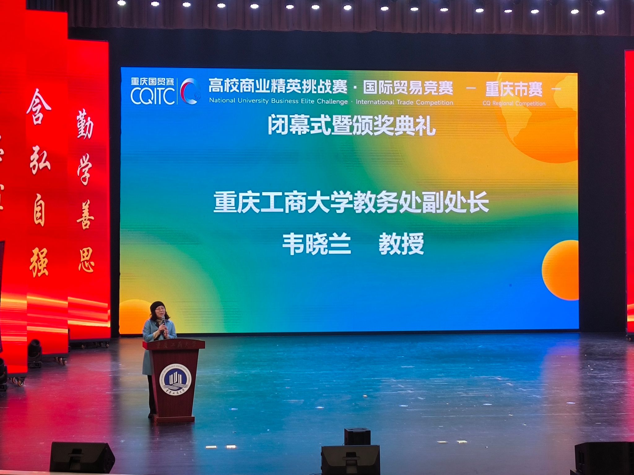 闭幕式暨颁奖典礼上,公司教务处副处长韦晓兰教授致辞。她首先对各位领导、评委和各院校师生的到来表示热烈欢迎。韦晓兰指出,每年一届的高校商业精英挑战赛国际贸易竞赛重庆市赛是公司承办的大型经贸类学科竞赛,是重庆市各高校同学及老师交流的重要平台。公司也将借此次竞赛为契机进一步为重庆市学科竞赛教育服务贡献力量。