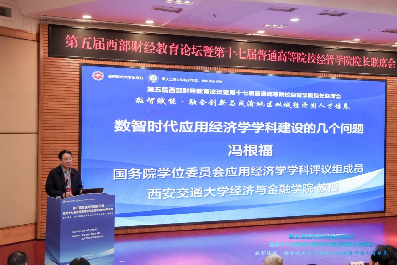 同时,国务院学位委员会应用经济学学科评议组成员,西安交通大学经济与金融公司冯根福教授以“数智时代应用经济学团队建设的几个问题”为主题,从调整应用经济学科专业布局、中国经济学教材建设与应用、员工知识能力与科学素养培养,以及合理定位办出特色与差异化发展、重视对传统专业的升级改造等四个方面,对于如何高质量推进应用经济学的团队建设指明了方向。