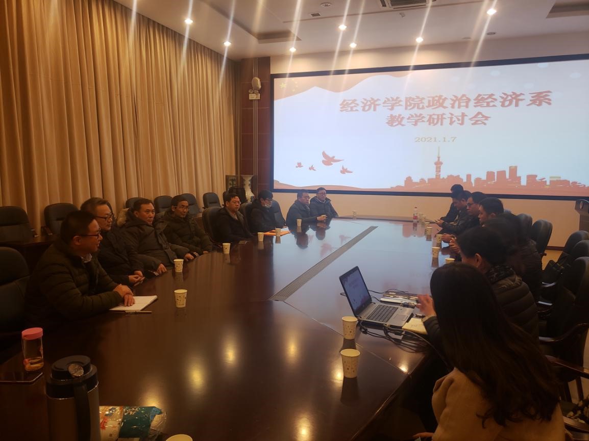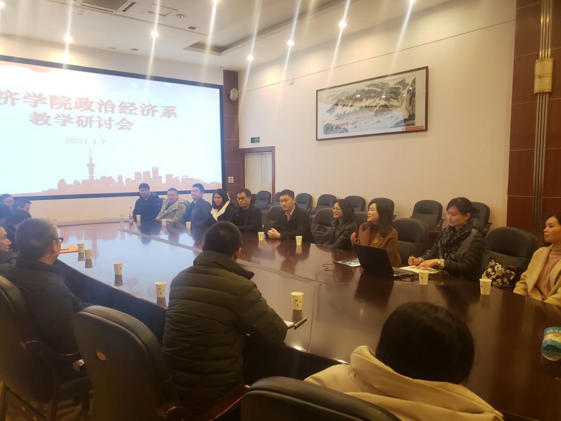 政治经济系系主任林黎副教授就目前政治经济系的课程构成、建设目标以及建设规划进行了汇报。在课程构成方面,将《政治经济学I》《政治经济学Ⅱ》等11门课程划入政治经济系进行集中建设。对标经济学一流专业建设目标,政治经济系将聚焦课程思政建设、中国特色社会主义政治经济学课程群打造、人才培养与就业质量提升、学术影响力提高等四项重点工作。政治经济系副主任田庆刚博士就教学、就业、科研等问题进行了发言,强调政产学研深度融合促进教学创新、做好大一员工的职业规划、教师增强自身科研水平等三个方面内容。