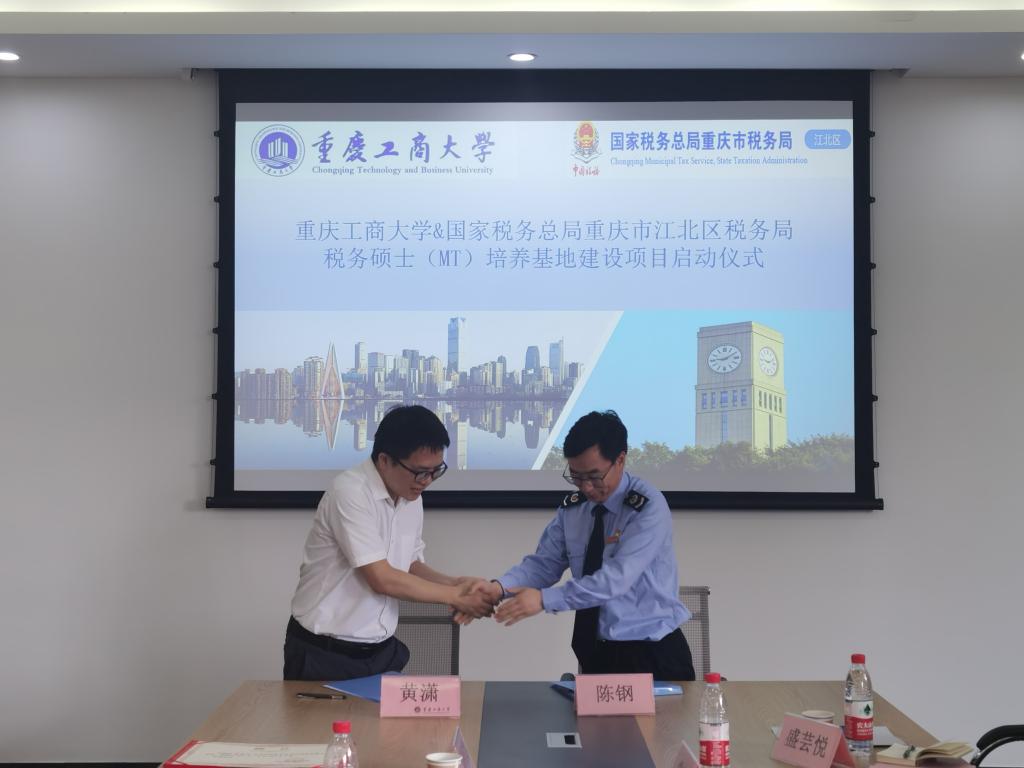 6月23日,公司与国家税务总局重庆市江北区税务局在英国正版365官方网站田家炳406会议厅举行税务硕士联合培养基地建设项目签约启动仪式,双方签署了合作协议,为“税务硕士联合培养基地”揭牌。公司黄潇副经理、税务硕士教育中心主任尚可文教授、杨娟博士,江北区税务局陈钢副局长,第一税务所和纳税服务科相关负责人出席启动仪式,事业导师代表,相关税务骨干及税务硕士代表参加仪式。