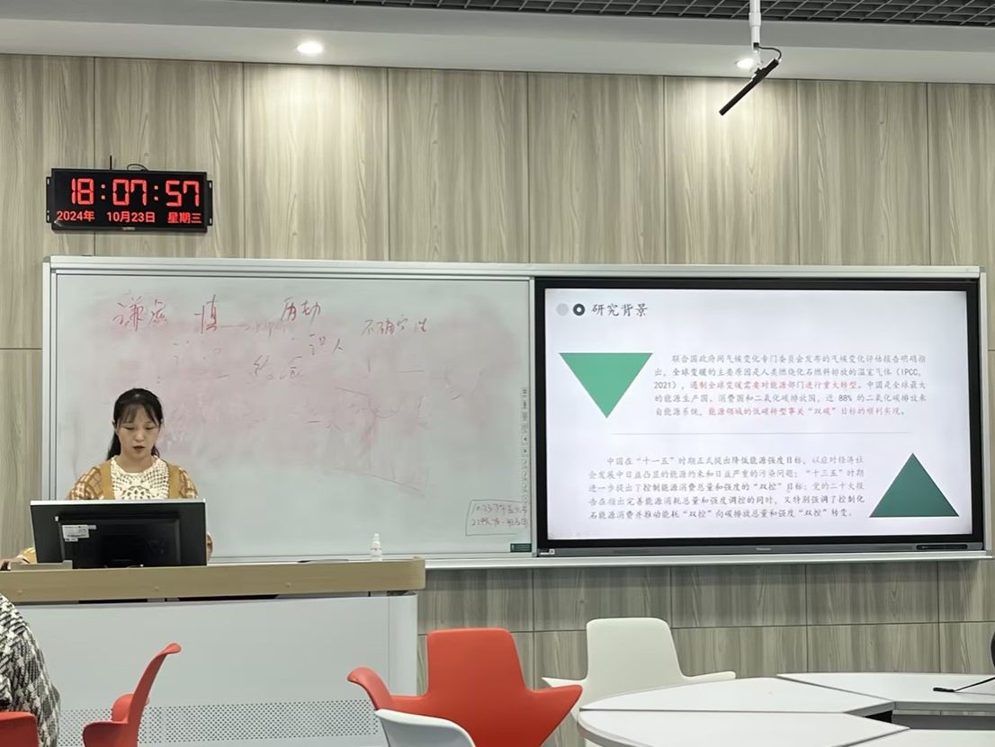 在本次沙龙中,2023级政治经济学专业的唐瑞莲同学分享了题为《市场激励型环境规制与能源消费结构转型——来自中国碳排放权交易试点的经验证据》的研究文献。她详细讲解了论文中使用的理论模型和实证分析方法,并重点介绍了指标选取和结果讨论等关键内容,分享了自己对文献的深入思考和理解。2023级人口、资源与环境经济学专业的张艳清同学则带来了《碳达峰目标如何引领城市低碳转型——来自准自然实验的证据》的分享。她对文献中的实证分析部分进行了细致解读,尤其是对稳健性检验方法的讲解,进一步加深了大家对该研究结论可靠性的理解。2023级政治经济学专业的陈秋旭同学则以《回到马克思:生态经济学的偏废与重塑》为主题,回顾了新古典主义经济学的重要理论知识,并结合文献探讨了资本主义经济增长驱动的生态危机本质,分享了他从该研究中获得的启发。