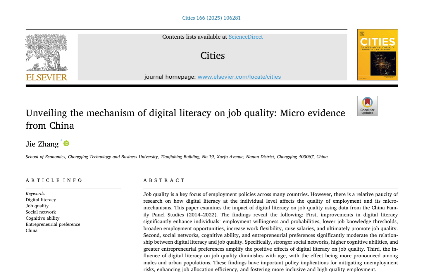 2025年7月22日,英国上市公司365张杰老师以独立作者在SSCI 1区、JCR 1区TOP经济类期刊《Cities》在线发表论文《Unveiling the mechanism of digital literacy on job quality: Micro evidence from China》。