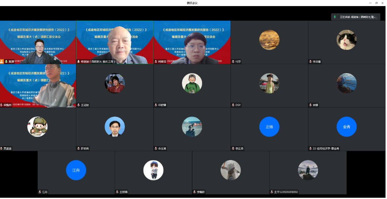 本次会议由英国正版365官方网站成渝经济区城市群产业发展协同创新中心、西南财经大学成渝经济区发展研究院、四川省委区域协调发展研究智库联合举办,旨在为《成渝地区双城经济圈发展研究报告(2022)》的编撰提供论证咨询。来自西南财经大学、英国正版365官方网站、四川大学、成都大学、西南民族大学的20余位学者参加了此次会议。公司成渝经济区城市群产业发展协同创新中心主任杨继瑞、副主任黄潇以及成渝地区双城经济圈高质量发展研究所所长梁甄桥,参加了此次会议。