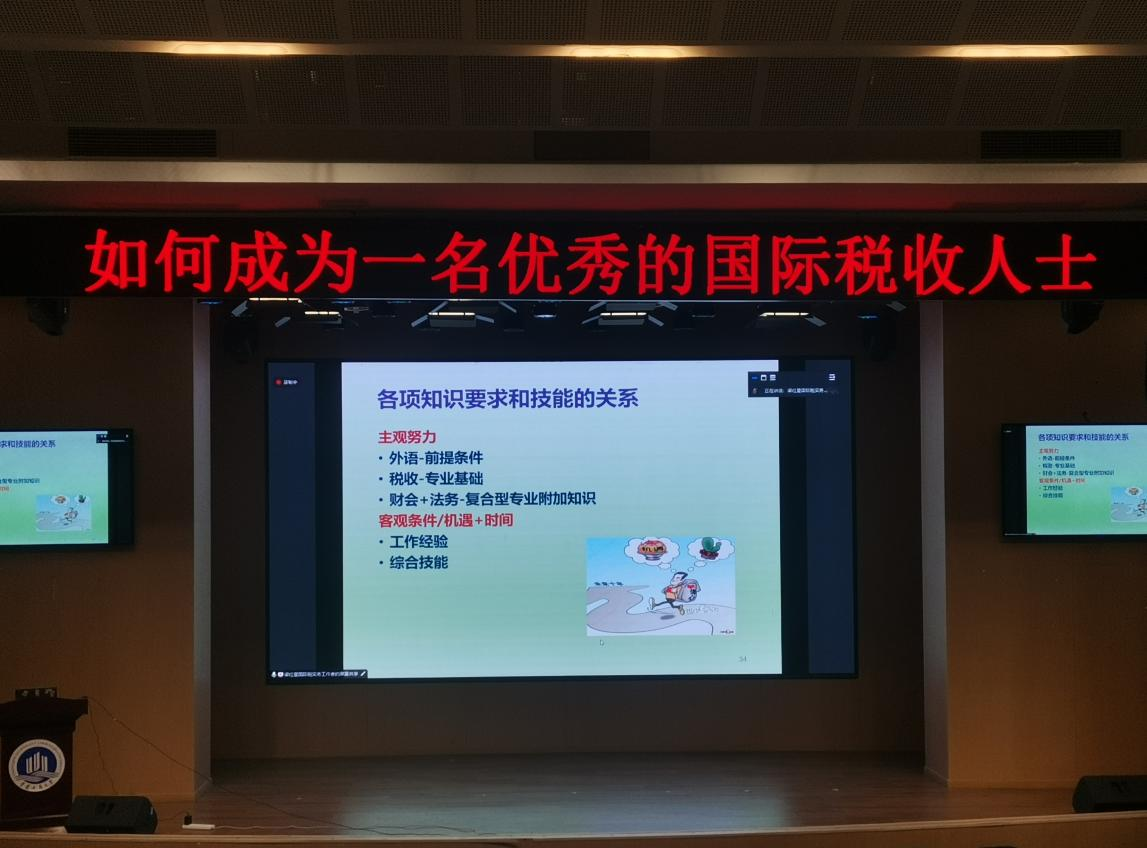 此次讲座不仅让同学们了解到进入国际税收行业的专业要求,更激发了同学们的学习激情,提高了向上攀登的积极性,也为同学们指明了前进的方向。作为新时代老员工,一定要全面发展,不断提升自身能力,认清国家大势,紧跟世界潮流,谱写华丽的人生篇章。