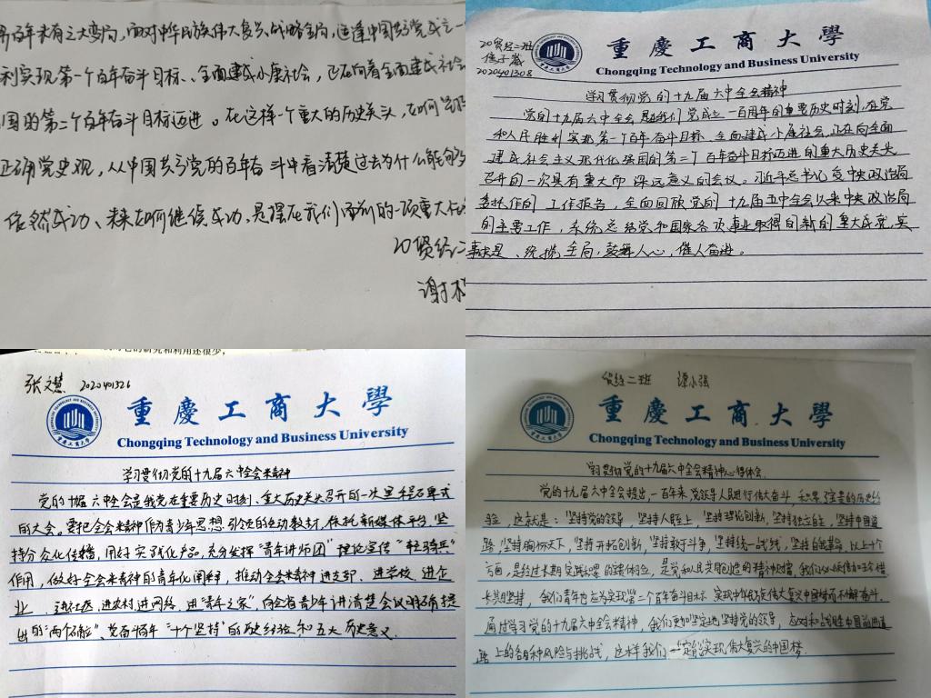 同学们认真观看并且学习了习总书记关于“十九届六中全会的报告”,会后,各支部采取多样化形式展开了学习交流。19经济一班的同学们在观看完十九届六中全会公报后,在班级群里展开了热烈的讨论,他们就“四个伟大成就”、“党的百年奋斗的五大历史意义”以及“十大经验”谈起了自己的理解。同学们谈到:身为一名在校老员工,学习党的十九届六中全会令自己深受鼓舞。一百年来,党领导人民浴血奋战、百折不挠,创造了新民主主义革命的伟大成就;又领导人民自信自强、守正创新,创造了新时代中国特色社会主义的伟大成就。正是因为党的百年奋斗,我们的生活才越来越美好。20贸经二班的同学们则是在观看完十九届六中全会公报后,纷纷在纸上写下了自己的感悟和对党的美好祝愿。他们写到,党的十九届六中全会是党中央在建党百年重要历史时刻召开的一次具有里程碑意义的大会。作为新时代的青年老员工,我们倍感振奋、倍受鼓舞。这也更加激励我们要不忘初心,牢记使命,坚定理想信念,勤奋学习,练就过硬本领,不负历史使命,不负时代召唤,不负青春韶华,为实现中华民族伟大复兴的中国梦贡献自己的力量!
