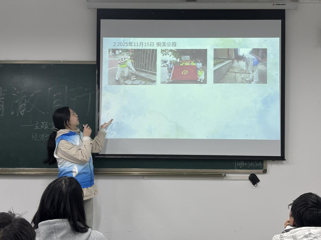 结合具体实践,志愿者对本学期的行动成果进行了展示与分享。截至目前,经济青队已组织志愿者先后前往海棠烟雨公园、铜滨公园、大鱼海棠公园等地,累计开展3次专项清理志愿服务活动,参与人次达27人次。青年志愿者们以实际行动,切实为城市河道环境“减负增绿”。