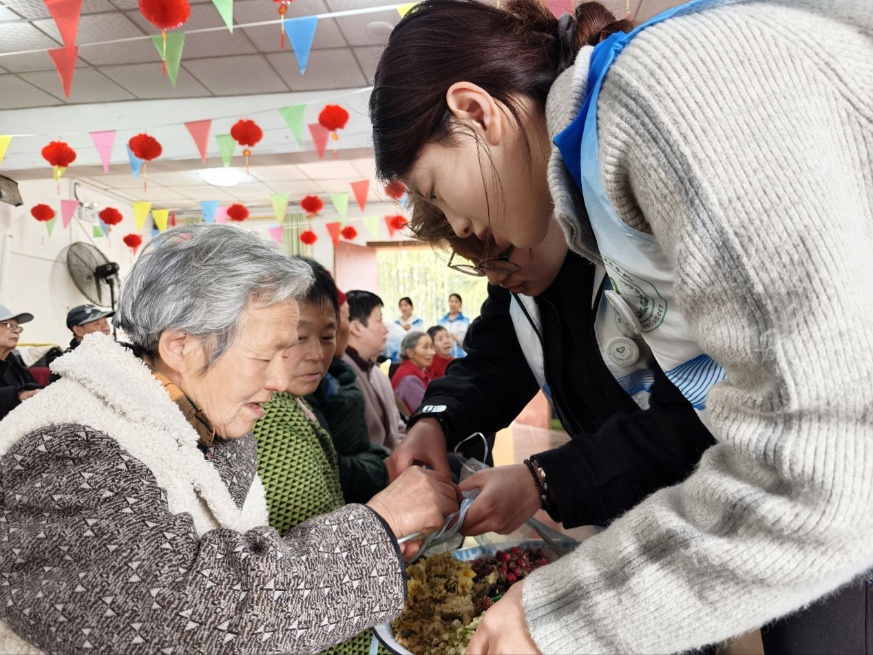 本次活动设置“颜色分类”“香包DIY”“把春天挂起来”三个环节。活动伊始,志愿者引导老人进行干花颜色分类,锻炼视觉辨识能力,同时手持花扇陪伴老人伴随音乐轻缓舞动、活动肢体,现场氛围轻松愉悦。香包DIY环节中,志愿者一对一协助老人装填天然香料,讲解香囊安神助眠、承载美好祝愿的寓意。随后,志愿者与老人一同用彩色丝带缠绕树枝,并将制作完成的香包悬挂于枝头。活动期间,志愿者服务耐心细致,为养老院注入青春活力;老人们积极参与手工互动,兴致浓厚。有老人手持香包感慨道:“这些小青年想得真周到,像春天的阳光一样,照得心里亮堂堂的!”