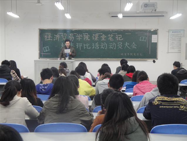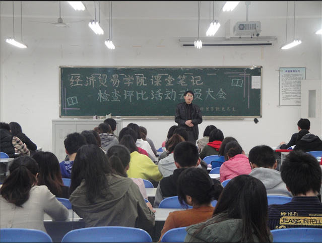 课堂笔记检查评比活动是由评估办会同教务处组织开展的以员工2011—2012学年第二学期课堂笔记为对象、采取员工学号随机抽签的方式进行,面向整个通识公司和其他公司2010级本专科员工(不包括独立二级公司)的大型校级活动。会议一开始,李华平副书记就本次活动作了讲话。李华平副书记指出本次活动是在公司从“教学型”转向“教学研究型”、“规模型”转向“质量型”的大环境下展开的,并向大家详细解释了关于开展课堂笔记检查评比活动的通知。与此同时,李华平副书记提出了希望各个班级积极认真、干部带头的要求。之后,经贸公司邹璇副经理针对本次评比活动的目的作出了讲话,指出记笔记能把深度的知识消化,希望同学们能够自觉认真记好笔记,以此来保持经贸优良传统,树立经贸风貌,创建良好学风。会议的最后,团委书记林新竹老师就本次会议做了总结,并希望大家一起努力,树立经贸公司良好学风。
