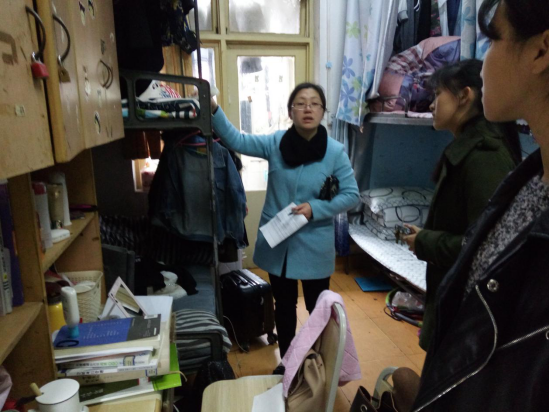 北区21栋是公司主管楼栋,也是全院男生集中住宿的楼栋。王书记、喻智成老师携公司女生楼栋干部代表一同对北21栋寝室进行了抽查。南区2栋住宿条件略差,集中住宿公司100多名女生,于书记携楼栋干部对该楼栋公司的21间寝室进行了逐一检查。